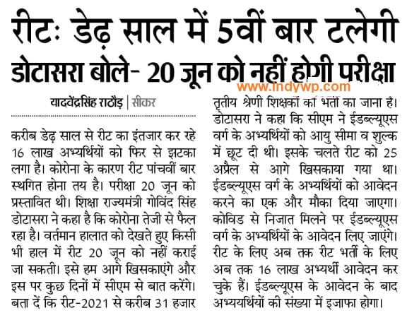 Reet त ज ज नकर Exam Date Sept 2021 र ट त ज सम च र From Various Patrika Bhaskar Iiird Grade Teacher Recruitmentreet त ज ज नकर Exam Date Sept 2021 र ट त ज सम च र From Various Patrika Bhaskar Iiird